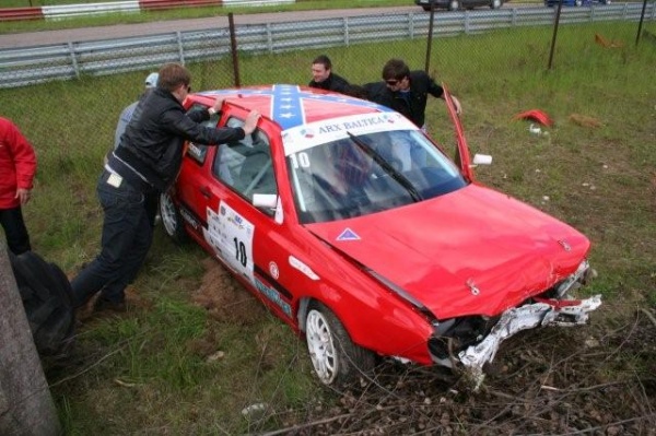 Alguses kui paremale välja läksin, olin positiivselt meelestatud ning arvasin, et tulen kenasti rajale tagasi. Aga kui asfaldile jõudes mingit pidamise muutust võrreldes muruga ei tekkinud, siis jõudsin küll mõelda, et ega siit midagi head oodata ei ole. Kohe pärast laksu käis peast läbi umbes selline mõttekäik: "radikas olemas, radika raam olemas, esituld pole, aga see on savi kah, käändtelg olemas, õõtshoob olemas - pole hullu tunniga on auto korras" Kõik olekski korda saanud (radikas ja radika raam polnud tegelikkuses viga isegi saanud), kui amordi ülemine kinnitus poleks ära murdunud. Tagasilla tala oli ka veidi väändunud, aga tagumise vasaku ratta saime üsna kiirelt sobivate seibide abil jälle õigesse suuna näitama panna. Hommikuks oli kohal AMK-st laenatud amort, aga ära oli ununenud see, et selle laenatud amordi jaoks oleks vaja olnud suurema läbimõõduga uniballi, mistõttu polnud öisest Kaunas-Tallinn-Kaunas reisist just liiga palju kasu